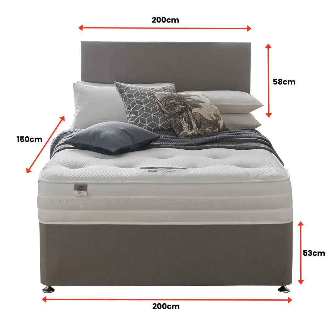King Size Divan Bed set with supportive mattress and matching headboard included. Features a durable wooden frame with fabric finish, providing stability and style. Mattress offers medium-firm comfort with quality fillings for restful sleep. Includes a padded headboard for added comfort. Ideal for modern bedrooms, easy to assemble, and available in multiple colors.
